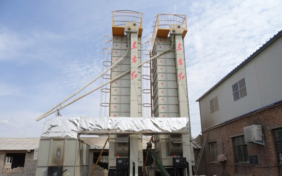 2臺東方紅5H-15循環(huán)式糧食烘干機正在進(jìn)行烘干作業(yè)